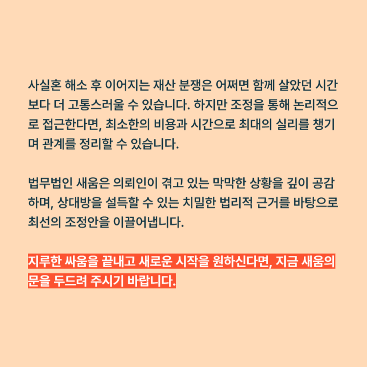 법무법인 새움은 의뢰인이 겪고 있는 막막한 상황을 깊이 공감하며, 상대방을 설득할 수 있는 치밀한 법리적 근거를 바탕으로 최선의 조정안을 이끌어냅니다. 지루한 싸움을 끝내고 새로운 시작을 원하신다면, 지금 새움의 문을 두드려 주시기 바랍니다.