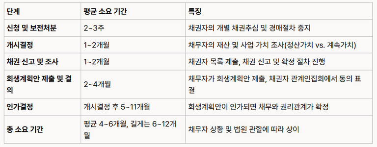 다음은 일반회생 절차의 단계별 소요 기간 및 특징을 정리한 표입니다.