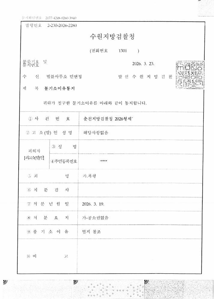 이와 동시에 혹시나 인정이 되지 않을 것을 대비하여 여러 양형자료들을 충분히 제출하였습니다. 그 결과 담당 검사는 초동 출동 당시 피해자의 의사표시가 있었다고 보아 해당 피의자를 공소권없음 처리하였습니다.