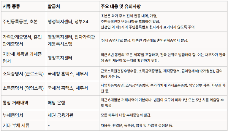 다음은 개인회생 신청 시 필수적으로 제출해야 하는 첨부서류 목록입니다. 각 서류의 발급처와 유의사항을 정확히 확인하여 재보정의 위험을 줄이는 것이 바람직합니다.