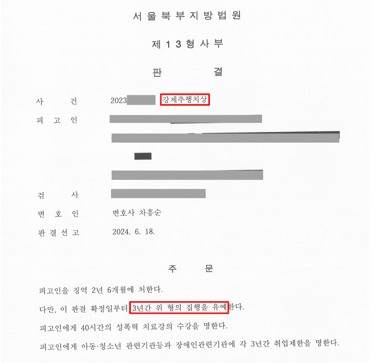 또한, 성폭력 치료강의 수강 명령, 아동·청소년 및 장애인 관련기관 취업제한 등의 부가처분이 내려졌으나, 실형 선고 없이 집행유예로 방어에 성공하였습니다.