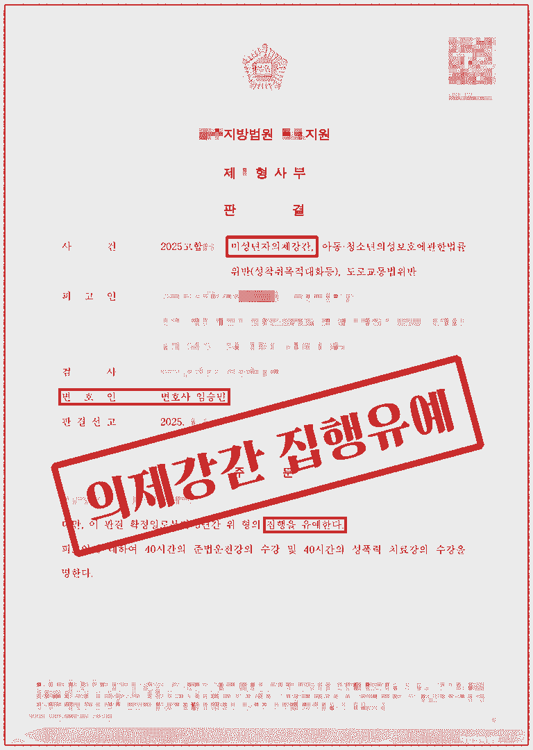 미성년자 의제강간, 성착취목적대화, 무면허운전 3개의 죄가 인정되는 중한 사건을 변호하여 집행유예 판결을 받아낸 성공사례 입니다.