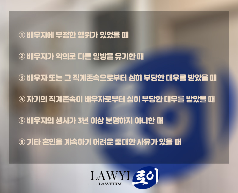 법이 규정하고 있는 이혼 사유는 6가지에 불과합니다. 그러나 민법은 이혼의 마지막 사유로 "기타 혼인을 유지하기 어려운 중대한 사유"가 있는 경우에 이혼을 인정하고 있습니다. 현실적인 이혼 사유들은 정말 다양합니다. 도박, 음주, 흡연, 외도, 시부모, 경제적 이유, 성격상 이유 등등...