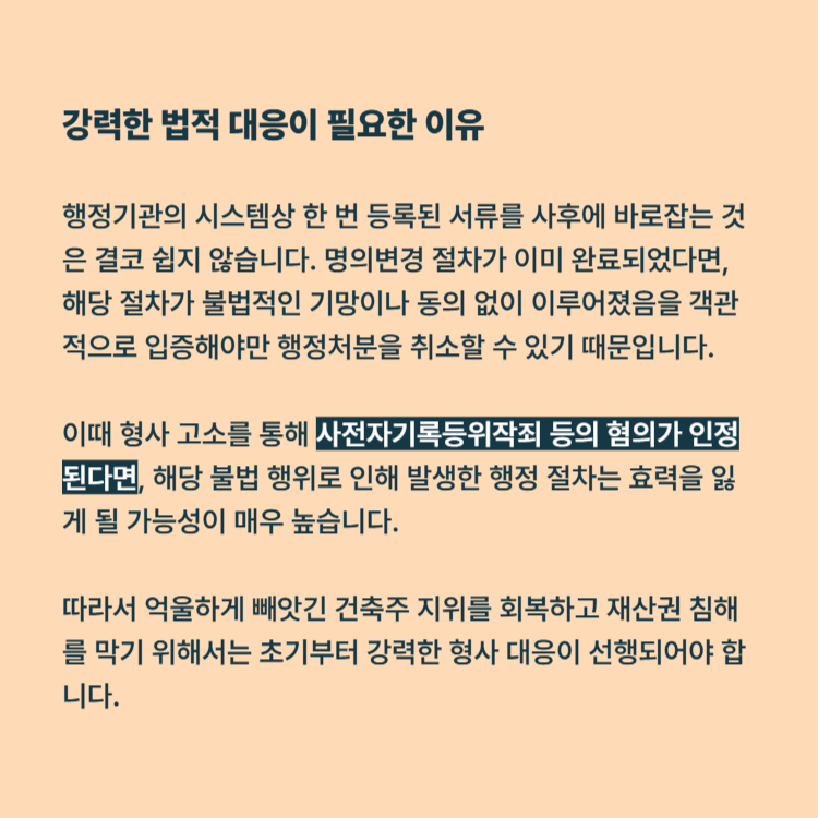 이때 형사 고소를 통해 사전자기록등위작죄 등의 혐의가 인정된다면, 해당 불법 행위로 인해 발생한 행정 절차는 효력을 잃게 될 가능성이 매우 높습니다. 따라서 억울하게 빼앗긴 건축주 지위를 회복하고 재산권 침해를 막기 위해서는 초기부터 강력한 형사 대응이 선행되어야 합니다.