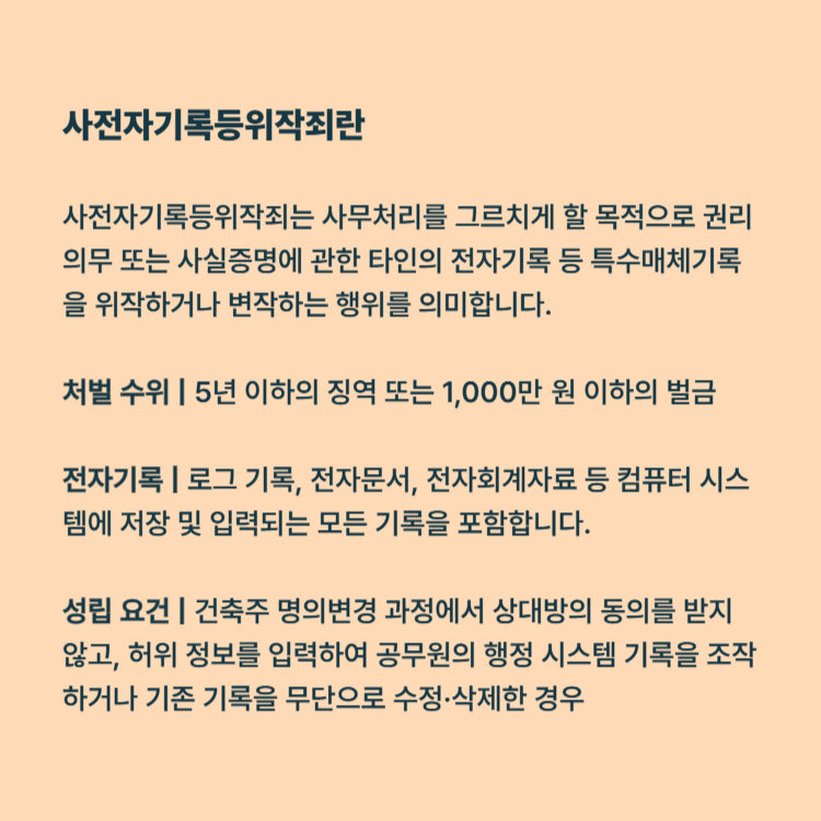 성립 요건: 건축주 명의변경 과정에서 상대방의 동의를 받지 않았음에도 불구하고, 허위 정보를 입력하여 공무원의 행정 시스템 기록을 조작하거나 기존 기록을 무단으로 수정·삭제했다면 본 죄가 성립할 수 있습니다.