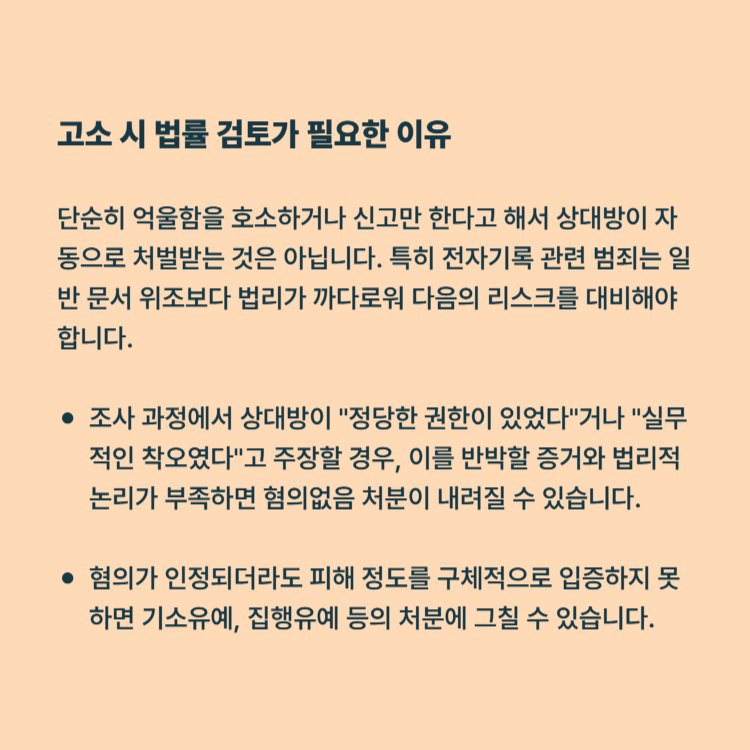 단순히 억울함을 호소하거나 신고만 한다고 해서 상대방이 자동으로 처벌받는 것은 아닙니다. 특히 전자기록 관련 범죄는 일반 문서 위조보다 법리가 까다로워 다음의 리스크를 대비해야 합니다.