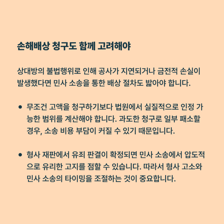 상대방의 불법행위로 인해 공사가 지연되거나 금전적 손실이 발생했다면 민사 소송을 통한 배상 절차도 밟아야 합니다.