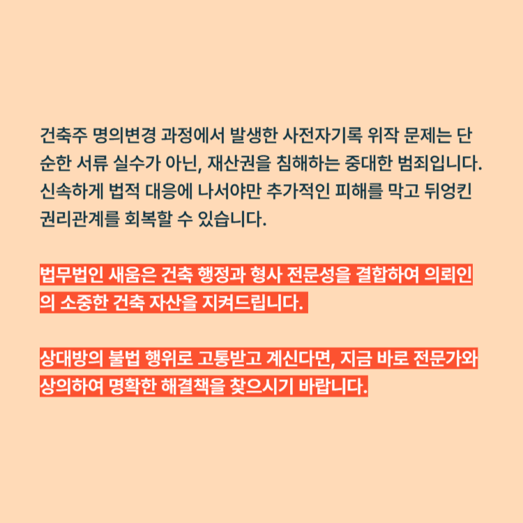 건축주 명의변경 과정에서 발생한 사전자기록 위작 문제는 단순한 서류 실수가 아닌, 재산권을 침해하는 중대한 범죄입니다. 신속하게 법적 대응에 나서야만 추가적인 피해를 막고 뒤엉킨 권리관계를 회복할 수 있습니다.