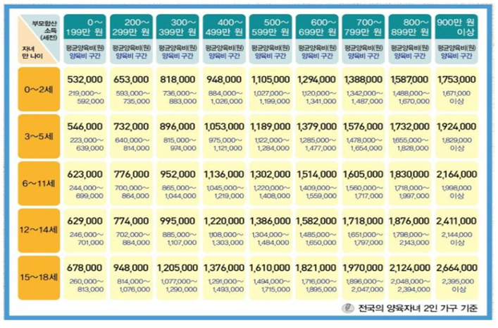 일반적으로 양육비는 매년 서울가정법원이 제시한 양육비산정기준표에 의하여 이루어집니다.
