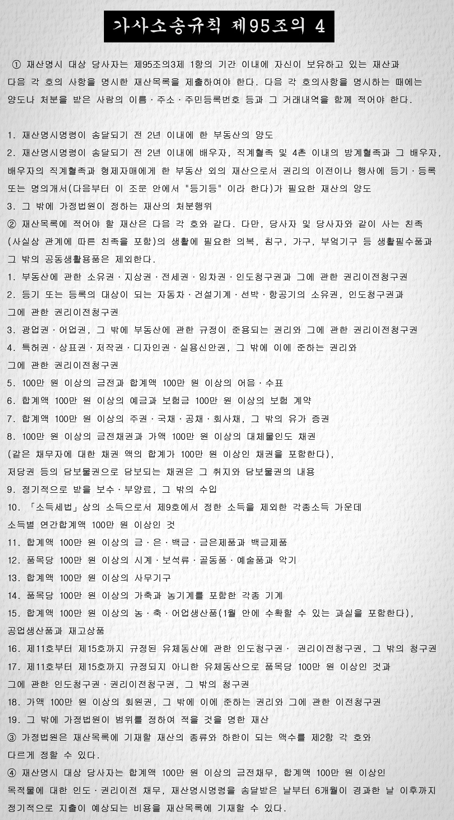 법은 아주 구체적으로 규정하고 있지만, 상대방이 위 목록을 제출하지 않는 경우도 많은데요. 이런 경우를 대비해서 위와 같은 법원의 명령에 대하여 정당한 사유 없이 재산목록의 제출을 거부하거나 거짓 재산목록을 제출하면 1천만 원 이하의 과태료가 부과됩니다.