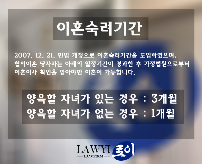 협의 이혼의 경우 2008년 이전에는 당사자 사이에 이혼 의사의 합치만 있으면 가정법원의 확인을 받아 신고하는 간이한 방식으로 성립하였으나 현재는 법이 개정되어 협의 이혼의 당사자는 가정법원이 제공하는 이혼에 관한 안내(이를 '협의이혼에 관한 안내 제도'라고 합니다.)를 받은 날부터 양육할 자녀가 있는 경우에는 3개월, 양육할 자녀가 없는 경우에는 1개월이라는 기간(이를 '이혼숙려기간 제도'라고 합니다)이 경과하여야 이혼 의사의 확인을 받을 수 있습니다.