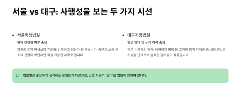 법원마다 고유한 실무 분위기가 있기 때문입니다. 대구지방법원은 채무의 성실성을 매우 중시하며, 특히 단기간에 집중된 투자나 고위험 파생상품 거래를 '단순 실패'가 아닌 '사행성 행위'로 엄격히 규정하여 금지명령을 제한하는 경향이 강합니다.