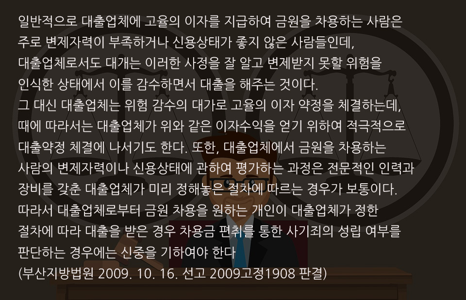 일반적으로 대출업체에 고율의 이자를 지급하여 금원을 차용하는 사람은 주로 변제자력이 부족하거나 신용상태가 좋지 않은 사람들인데, 대출업체로서도 대개는 이러한 사정을 잘 알고 변제받지 못할 위험을 인식한 상태에서 이를 감수하면서 대출을 해주는 것이다. 그 대신 대출업체는 위험 감수의 대가로 고율의 이자 약정을 체결하는데, 때에 따라서는 대출업체가 위와 같은 이자수익을 얻기 위하여 적극적으로 대출약정 체결에 나서기도 한다. 또한, 대출업체에서 금원을 차용하는 사람의 변제자력이나 신용상태에 관하여 평가하는 과정은 전문적인 인력과 장비를 갖춘 대출업체가 미리 정해놓은 절차에 따르는 경우가 보통이다. 따라서 대출업체로부터 금원 차용을 원하는 개인이 대출업체가 정한 절차에 따라 대출을 받은 경우 차용금 편취를 통한 사기죄의 성립 여부를 판단하는 경우에는 신중을 기하여야 한다(부산지방법원 2009. 10. 16. 선고 2009고정1908 판결)