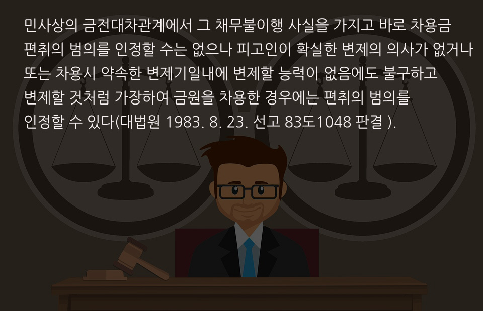민사상의 금전대차관계에서 그 채무불이행 사실을 가지고 바로 차용금 편취의 범의를 인정할 수는 없으나 피고인이 확실한 변제의 의사가 없거나 또는 차용시 약속한 변제기일내에 변제할 능력이 없음에도 불구하고 변제할 것처럼 가장하여 금원을 차용한 경우에는 편취의 범의를 인정할 수 있다(대법원 1983. 8. 23. 선고 83도1048 판결 ).