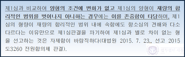 항소가 기각된 판결문에는 대부분 대법원 2015도3260 전원합의체 판결이 인용됩니다. 이는 1심과 비교하여 양형 조건에 변화가 없고 1심의 판단이 재량의 합리적인 범위를 벗어나지 않는다면 이를 존중해야 한다는 취지의 판례입니다.