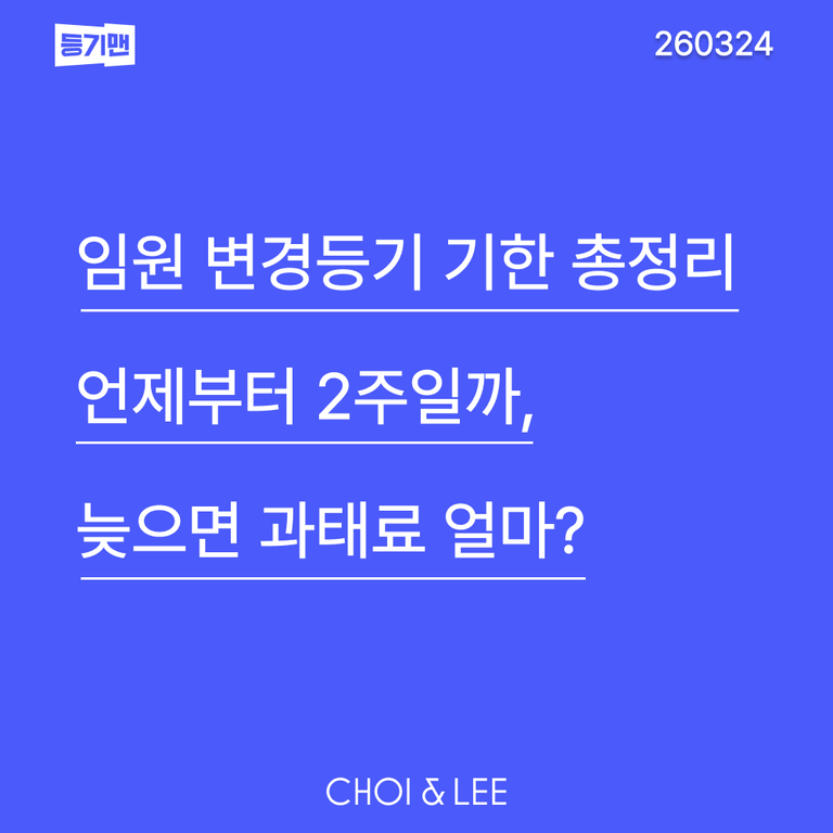 생각보다 많은 대표님들이 임원의 변경이나 임기 만료 등 사항을 제때 변경등기를 못해서 과태료를 내야하는 상황이 많습니다. 이사나 감사가 바뀌었는데 도대체 언제까지 등기해야 하는지, 기산점은 주주총회 결의일인지 취임일인지, 중임과 퇴임은 또 어떻게 다른지 헷갈리기 쉽습니다. 특히 정기주주총회 시즌에는 임원 임기 만료와 중임등기가 한꺼번에 몰리기 때문에 실무상 과태료가 가장 많이 발생하는 영역이기도 합니다.