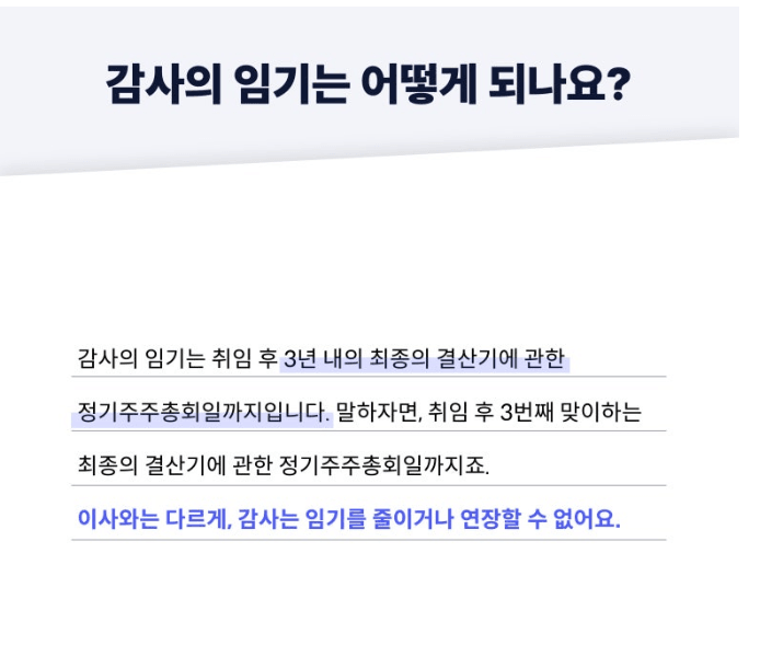 반면 감사는 더 명확합니다. 감사의 임기는 취임 후 3년 내 최종의 결산기에 관한 정기주주총회의 종결시까지이므로, 감사는 원칙적으로 정기주총일과 임기 종료일이 연결됩니다. 즉, 감사는 “3년 되는 날짜”만 보면 틀릴 수 있습니다.