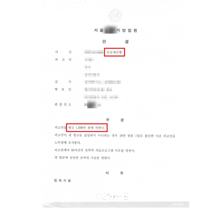 법원은 가해자의 행위가 명백히 인정된다고 판단하여 유죄를 인정하고, 가해자에 벌금 1천 500만원을 선고하였습니다.