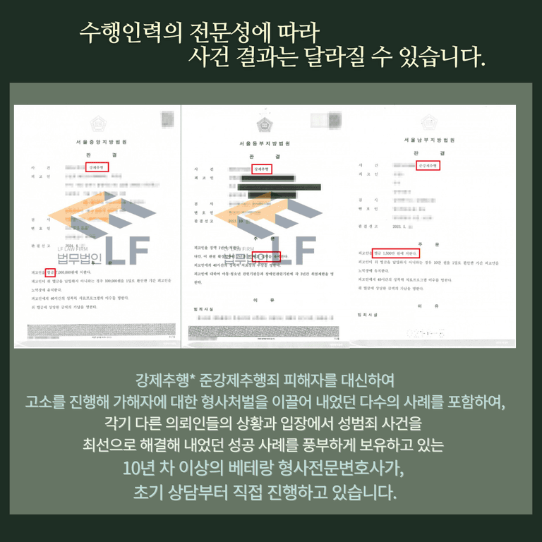 본 사건과 같이 피해자를 대리하여 고소를 진행하여 성공적인 결과를 이끌어낸 경험은 물론, 반대로 피의자 입장에서 기소유예, 경찰 불송치, 무혐의, 무죄 등의 결과를 도출해 온 사례 역시 다수 보유하고 있습니다.
