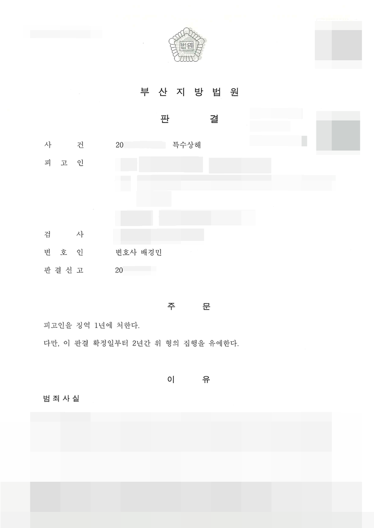 ✅ 극적인 합의 성공: 특수상해 사건에서 실형을 면하려면 피해자의 용서가 절대적입니다. 변호인이 나서서 피해자에게 진심 어린 사죄를 전하고 합의금을 조율하여, 끝내 "피고인의 처벌을 원하지 않는다"는 처벌불원서를 받아냈습니다.