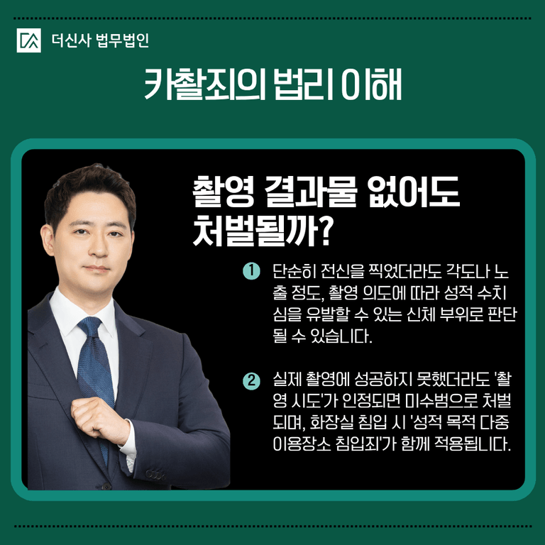 특히 화장실이라는 공간의 특성상, 설령 촬영 버튼을 누르기 전이라 하더라도 기기를 설치하거나 촬영을 시도한 정황만으로도 미수범 처벌을 피하기 어렵습니다.