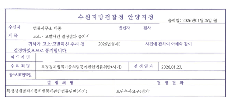 검찰은 의뢰인들(고소인들)에 대하여 모두 재수사할 것을 요구하며 특경법위반(사기) 혐의의 보완수사요구 명령 처분을 하였습니다.