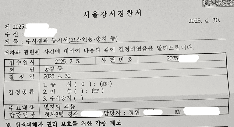 결국, 의뢰인이 원했던 가해자에 대한 모든 범죄가 경찰 송치 처분이 되었고, 검찰로 사건이 넘어갈 수 있었습니다. 그리고, 의뢰인이 가장 바랬던 (고소 대리를 진행함과 동시에) 상대방으로부터의 괴롭힘이 차단되었고, 경찰 및 검찰의 수사에 신속히 협조하여 재차 피해가 발생하지 않도록 방지할 수 있었습니다.