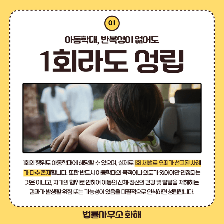 아이 훈육을 위해서 한두 번 때린 건데 설마 처벌까지 되겠냐고 생각할 수 있겠지만, 현실에서는 그 한 번이 문제의 시작이 되는 경우가 많습니다. 아동복지법상 아동학대는 단 1회의 행위만으로도 성립할 수 있다는 것입니다. "한 번뿐이었다"는 주장은 그 자체로 법적 방어 논리가 되지 않으며, 실제로 1회 체벌로 유죄가 선고된 사례도 다수 존재합니다.