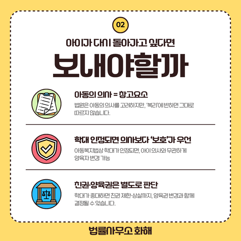 아울러 민법 제915조(친권자의 징계권)가 폐지되면서, 훈육 목적의 체벌 자체가 법적으로는더 이상 허용되지 않는다는 점도 중요합니다. 또한 실제 사례들에서는 신체적 체벌만이 문제가 되는 것은 아닌데요. 아동의 정신건강과 발달에 해를 끼칠 정도의 정서적 학대 역시 아동복지법 위반이며, 아이를 갈등 상황에 반복 노출 시키거나, 상대 배우자의 험담 및 폭언을 통한 심리적 압박도 정서적 학대로 문제가 될 수 있습니다.