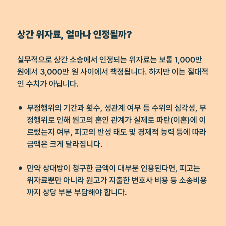 피고 입장에서 가장 현실적인 걱정은 단연 돈입니다. 실무적으로 상간 소송에서 인정되는 위자료는 보통 1,000만 원에서 3,000만 원 사이에서 책정됩니다. 하지만 이는 절대적인 수치가 아닙니다.