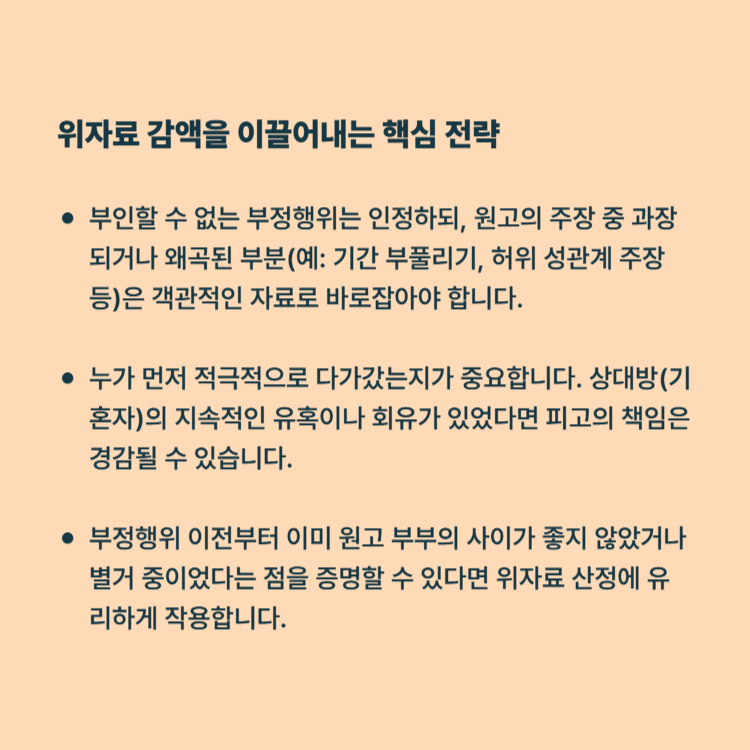 소송비용의 함정: 만약 상대방이 청구한 금액(예: 3,000만 원)이 대부분 인용된다면, 피고는 위자료뿐만 아니라 원고가 지출한 변호사 비용 등 소송비용까지 상당 부분 부담해야 합니다. 따라서 적극적인 방어를 통해 인용 금액을 최대한 낮추는 것이 소송비용 절감 측면에서도 필수적입니다.
