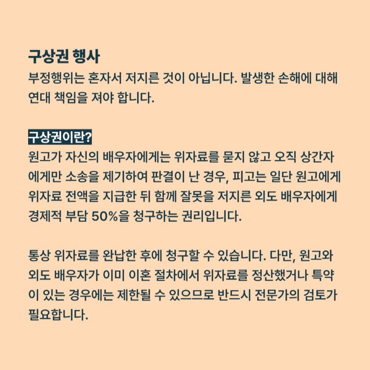 통상 위자료를 완납한 후에 청구할 수 있습니다. 이를 통해 피고는 실질적인 경제적 부담을 50%가량 줄일 수 있습니다. 다만, 원고와 외도 배우자가 이미 이혼 절차에서 위자료를 정산했거나 특약이 있는 경우에는 제한될 수 있으므로 반드시 전문가의 검토가 필요합니다.