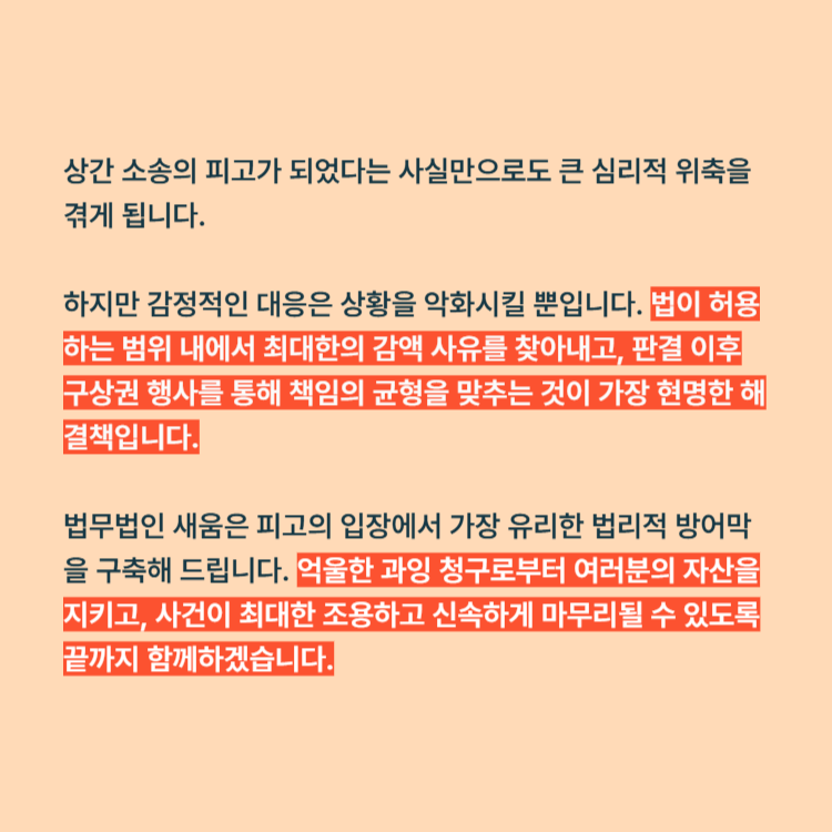 법무법인 새움은 피고의 입장에서 가장 유리한 법리적 방어막을 구축해 드립니다. 억울한 과잉 청구로부터 여러분의 자산을 지키고, 사건이 최대한 조용하고 신속하게 마무리될 수 있도록 끝까지 함께하겠습니다.