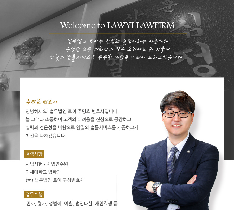 안녕하세요. 여러분의 주변에 항상 대기 중인 법무법인 로이의 주명호 변호사입니다.