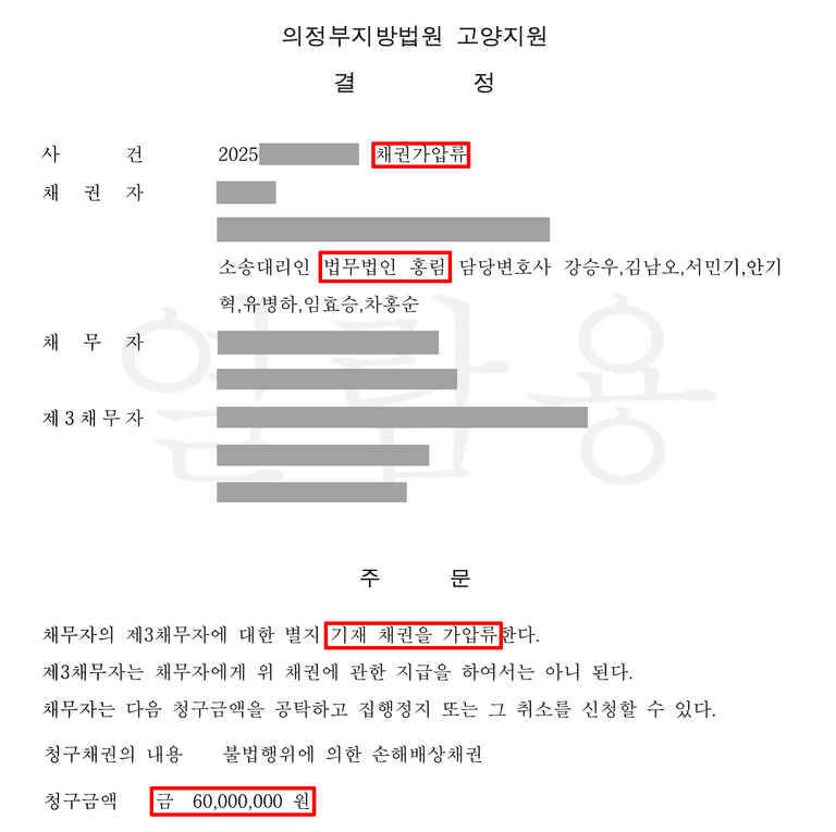 법무법인 홍림의 신속하고 전략적인 대응을 통해 피의자들에 대한 사기 및 사기방조, 전자금융거래법 위반 혐의 수사 진행 기반 확보와 동시에 6,000만 원 채권가압류 인용 결정 확보하였습니다.