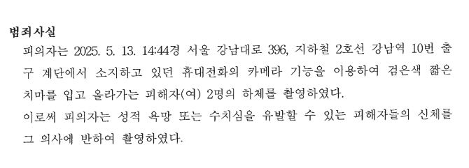 의뢰인은 2025년 5월 13일 14:44경, 서울 강남역 10번 출구 계단에서 휴대전화 카메라를 이용하여 치마를 입고 올라가는 여성 피해자 2명의 하체를 동의 없이 촬영한 혐의로 조사를 받게 되었습니다. 본 사건은 성폭력범죄의처벌등에관한특례법위반(카메라등이용촬영)에 해당하여 엄중한 처벌이 예상되는 상황이었습니다.