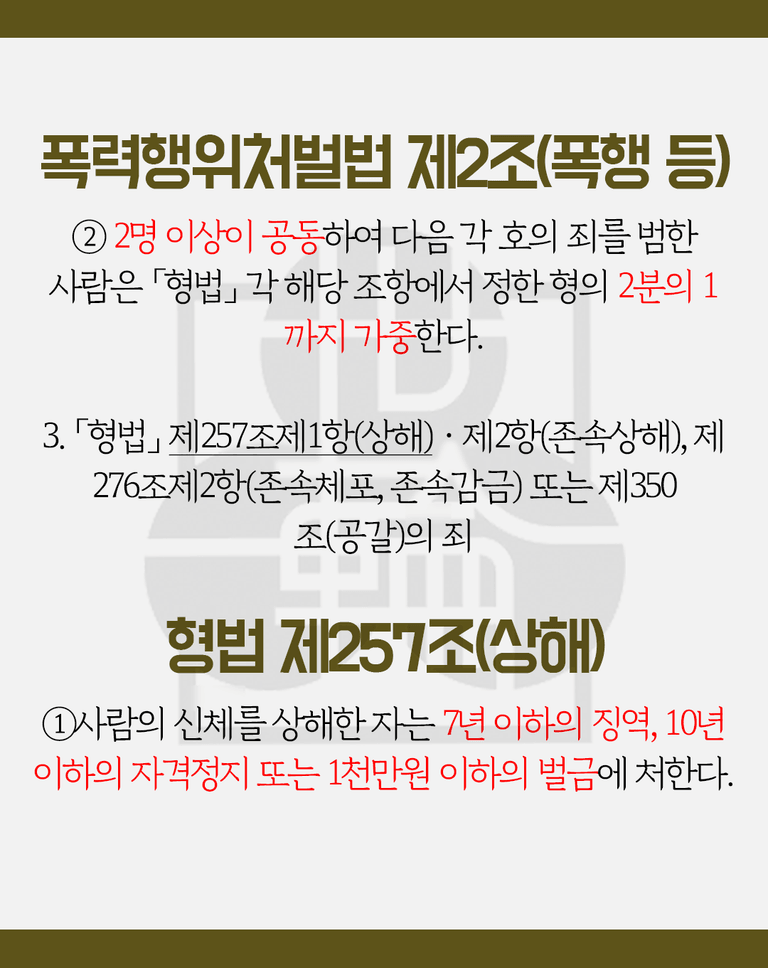 수사기관은 이를 단순한 중재가 아닌 공동으로 상해를 가한 행위로 보아 폭처법 공동상해 혐의를 적용했습니다.