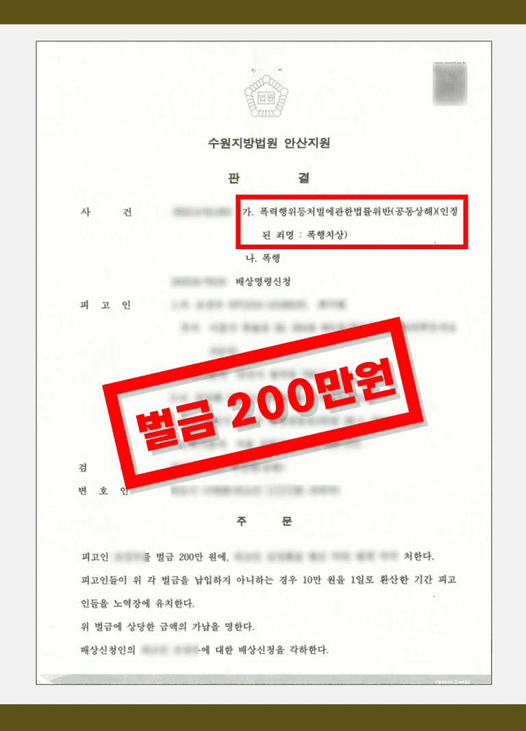 이에 따라 폭처법 공동상해는 인정되지 않았고, 개별 행위에 대한 책임만 인정되어 폭행치상으로 변경되었습니다. 최종적으로 사건은 벌금형으로 마무리되었습니다.