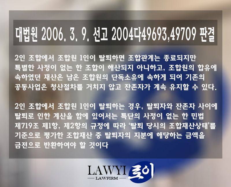 다만 동업관계자가 여러 명이 아니고 2인의 조합 관계에서는 조합원 1인이 탈퇴하는 경우에는 조합관계는 종료가 되고 특별한 사정이 없는 한 조합은 해산되지 아니하고 조합원들의 합유 재산은 남은 조합원의 단독 소유에 속하게 되고, 탈퇴자는 민법 제 791조에 따라 '탈퇴 당시의 조합재산상태'를 기준으로 평가한 금액에 대하여 탈퇴지가 금원을 반환받게 됩니다(대법원 2006. 3. 9. 선고 2004다49693, 49709 판결).