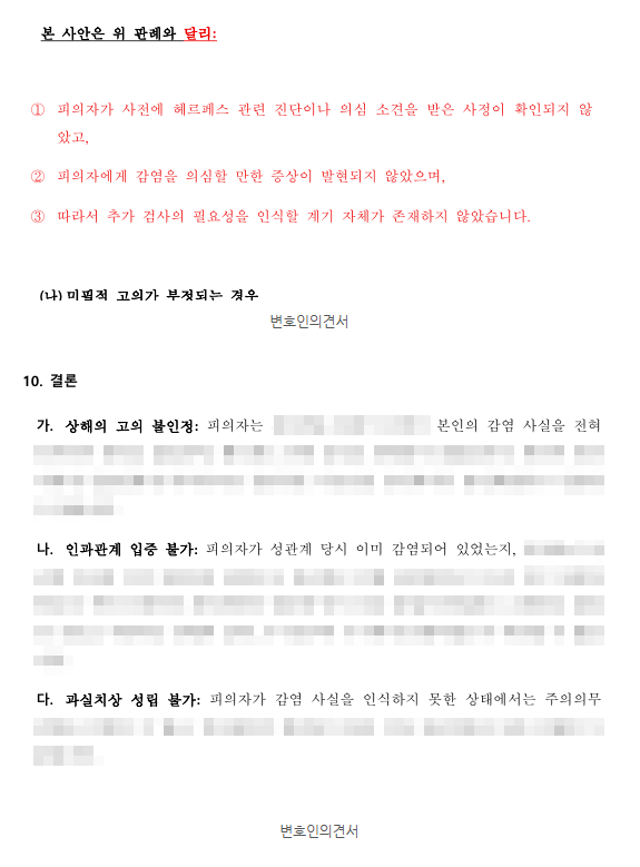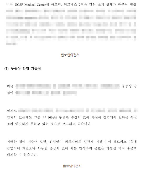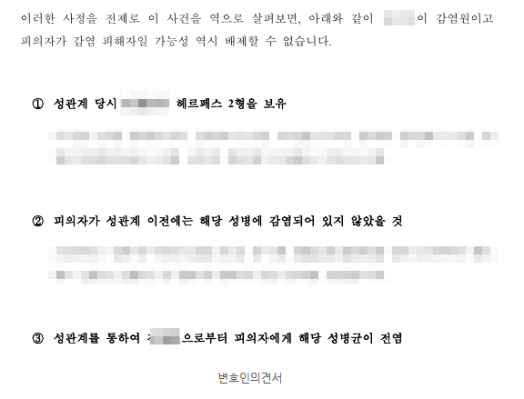 더 나아가, 오히려 피의자가 피해자로부터 감염되었을 가능성까지 열어두었습니다. 피의자의 성관계 이전 음성 결과에 비추어, 감염의 방향이 피의자 → 피해자라고 단정하기 어렵다는 점을 논리적으로 구성하였습니다.