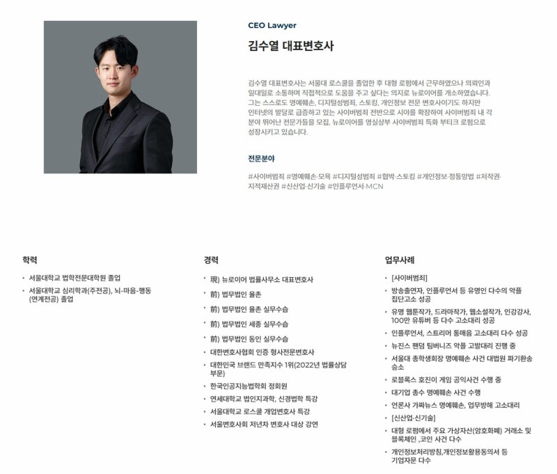 뉴로이어 법률사무소 김수열 대표변호사입니다.
