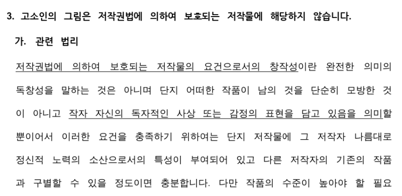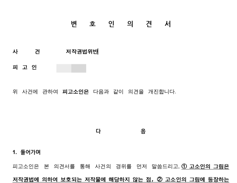 저희는 먼저 상대방의 그림 자체가 법적으로 보호받기 위해 필요한 창작성을 충분히 갖추지 못했다는 점을 중점적으로 검토했습니다. 또한 그림과 별개로 등장하는 캐릭터 역시 독자적인 창작성이 인정되기 어렵다는 점을 구체적으로 설명했습니다. 즉, 애초에 저작권으로 보호되는 대상이 아닐 가능성을 먼저 짚은 것입니다.