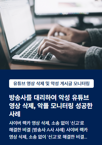 저희는 유튜브 저작권 고소 대응, 영상 삭제 및 복구, 반론통지 등 다양한 실무 경험을 바탕으로 의뢰인의 리스크를 최소화하는 해결 방안을 제시해드립니다.