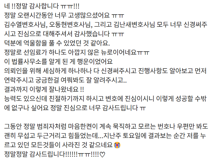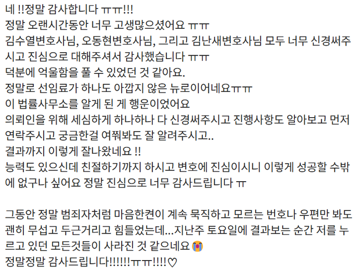 실제 의뢰인분 후기 - 그동안 고생 많이 하셨는데 평온한 일상으로 돌아가시길 바라겠습니다 정말 수고하셨습니다