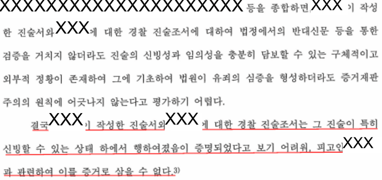 법원은 "위 청소년들의 진술서, 경찰 진술조서에 대하여 법정에서의 반대신문 등을 통한 검증을 거치지 않더라도 진술의 신빙성과 임의성을 충분히 담보할 수 있는 구체적이고 외부적인 정황이 존재하여 그에 기초하여 법원이 유죄의 심증을 형성하더라도 증거재판주의의 원칙에 어긋난다고 평가하기 어렵다.