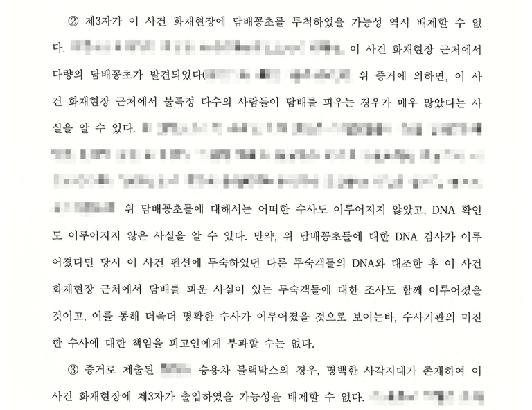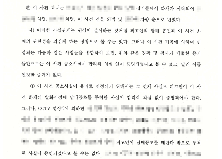 따라서 1심에서 유죄의 근거로 인정된 간접증거들만으로는 A씨가 피운 담배로 인해 화재가 발생했음을 명확히 입증할 수 없을 뿐더러, 제3자가 해당 사건에 영향을 미쳤을 가능성 역시 완벽히 배제할 수 없습니다.