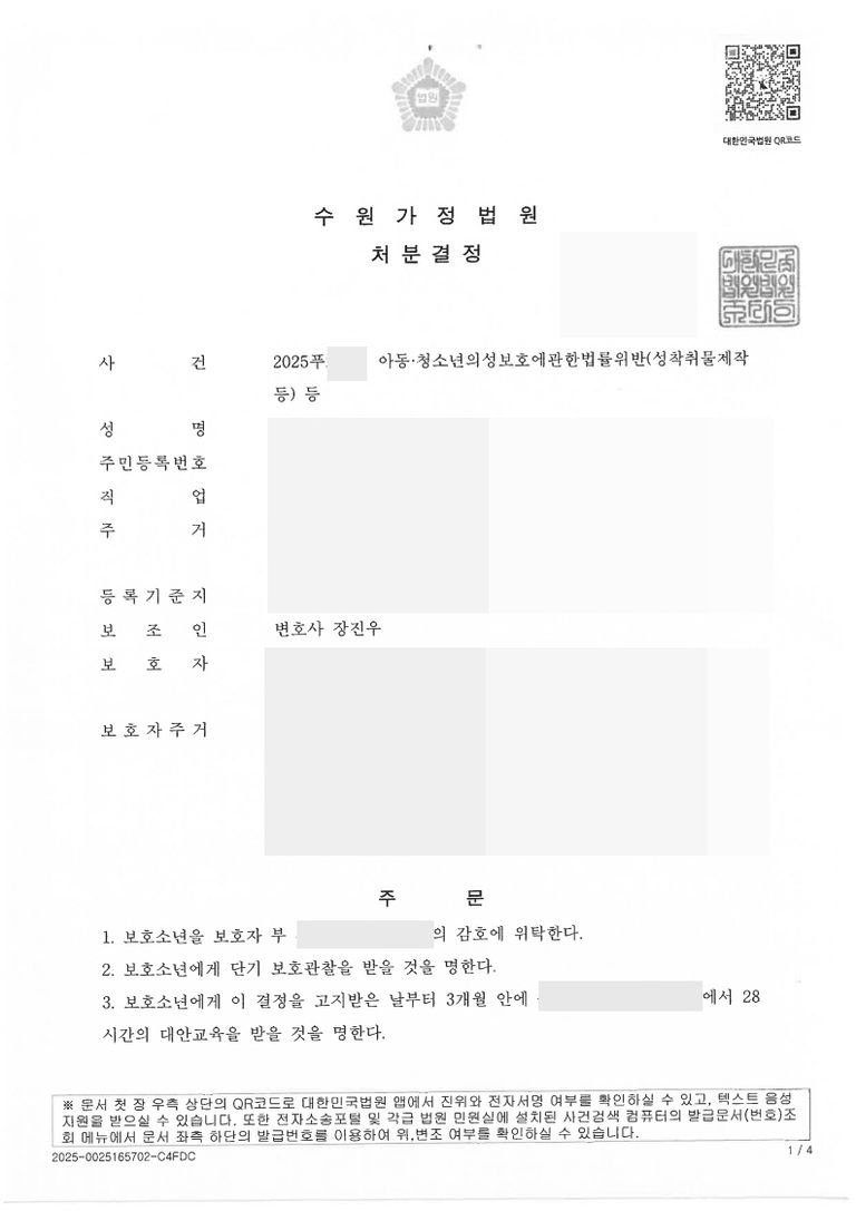 보호자의 강력한 선도 의지: 부모님이 의뢰인의 평소 생활을 밀착 관리하고 있으며, 재발 방지를 위해 교육 및 감호에 최선을 다할 것을 법원에 약속했습니다. 소년사건은 특성상 소년만 재판을 받는 것이 아니라 실질적으로 부모도 함께 평가를 받는 것이므로 부모의 강력한 훈육 의지를 보여주는 것이 매우 중요합니다.