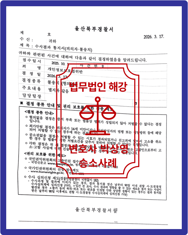 저희 법무법인 해강은 법리적인 검토를 통하여 의뢰인 상황에 맞춘 변호인 의견서 등 작성을 통하여 의뢰인을 위해 최선을 다하였고 이에 [개인정보보호법위반 불송치]를 이끌어냈습니다.