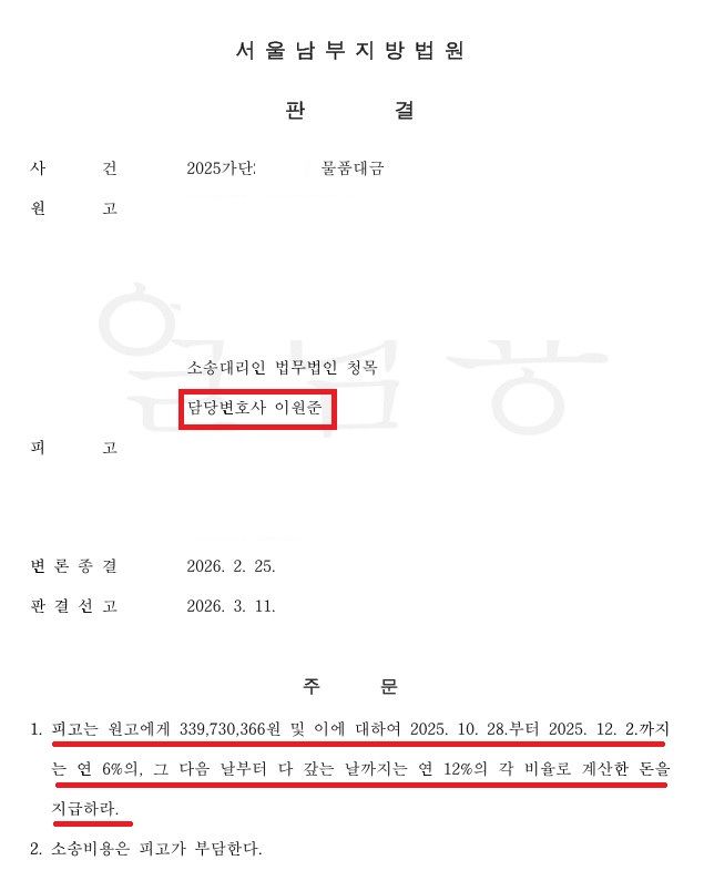 위와 같은 필자의 조력으로 의뢰인은 3억 4천만 원가량의 물품대금에 대한 집행권원을 신속하게 확보하였고, 회사 운영에도 상당한 도움이 될 수 있었다.
