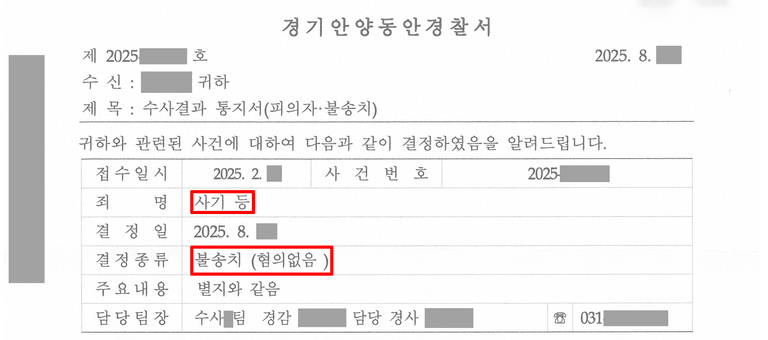 수사기관은 법무법인 홍림의 주장을 받아들여 사기 및 업무상횡령 혐의 모두 인정되지 않음을 인정하고, 증거불충분으로 불송치(혐의없음) 결정이라는 결론을 내렸습니다.